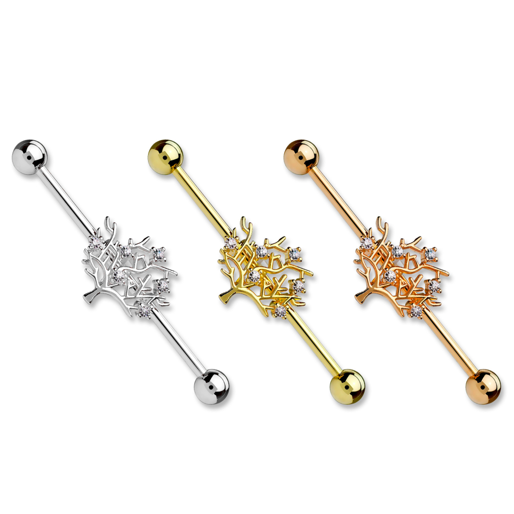 The barbell is made of surgical steel, and it's available in three colors. The only difference between the models is their colors; their shape and the clear stones are the same. The tree is made of brass and it has been covered afterward with a color layer.