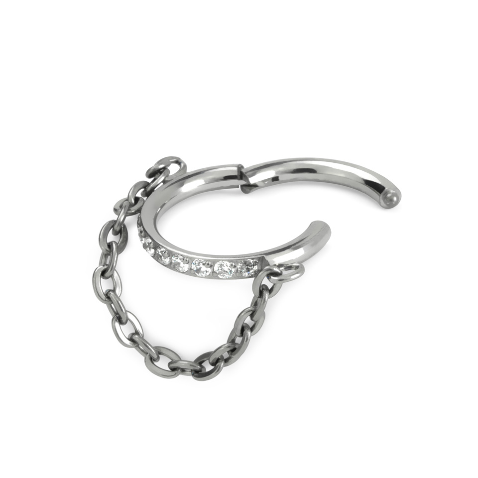 Titanium hinged ring featuring a row of delicate stones and a chain detail. The chain is attached at both sides, about halfway down to hang just a little below the bottom of the ring.