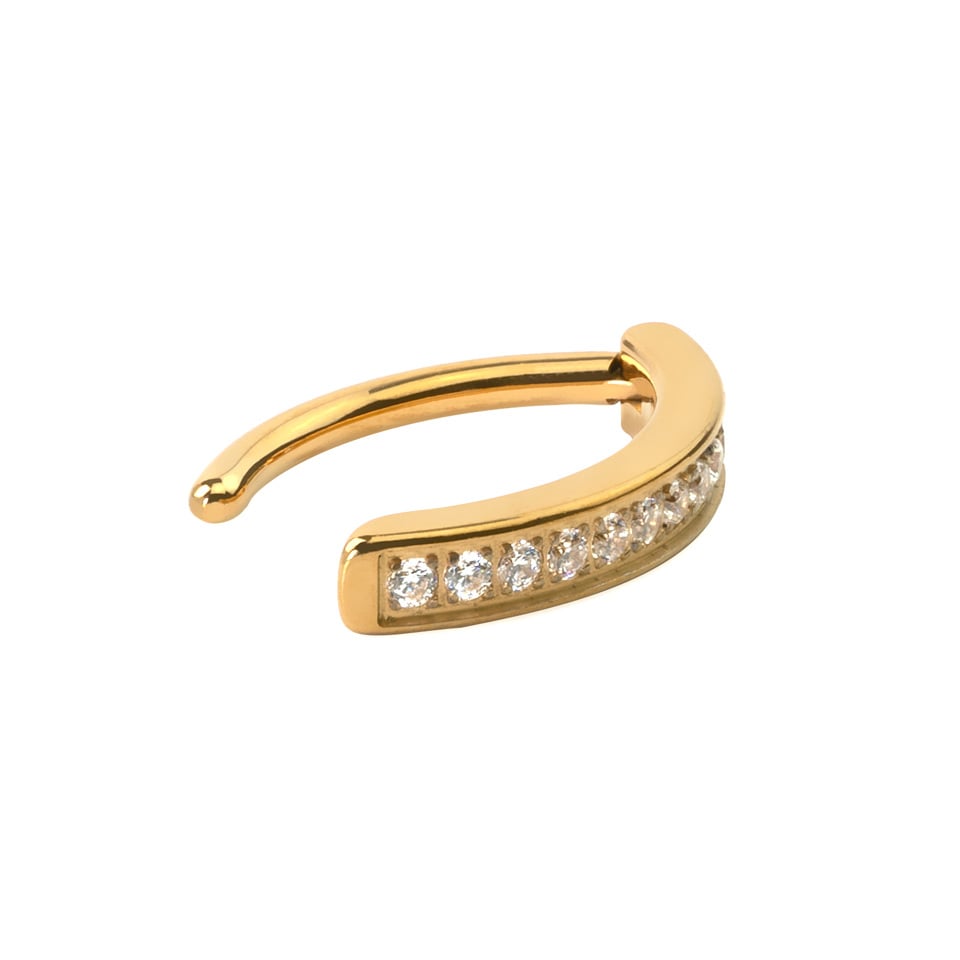 This glamourous belly clicker features a row of clear gemstones to add a glamourous touch to your look with this stylish piece of jewelry. The shallow curve of this belly clicker means it sits closer to the body than a conventional ring, making it really practical to wear. It is made of implant-grade titanium, meaning it is hypoallergenic, lightweight, and durable.