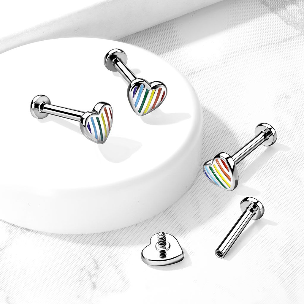 Name: Labret with internally threaded striped rainbow heart