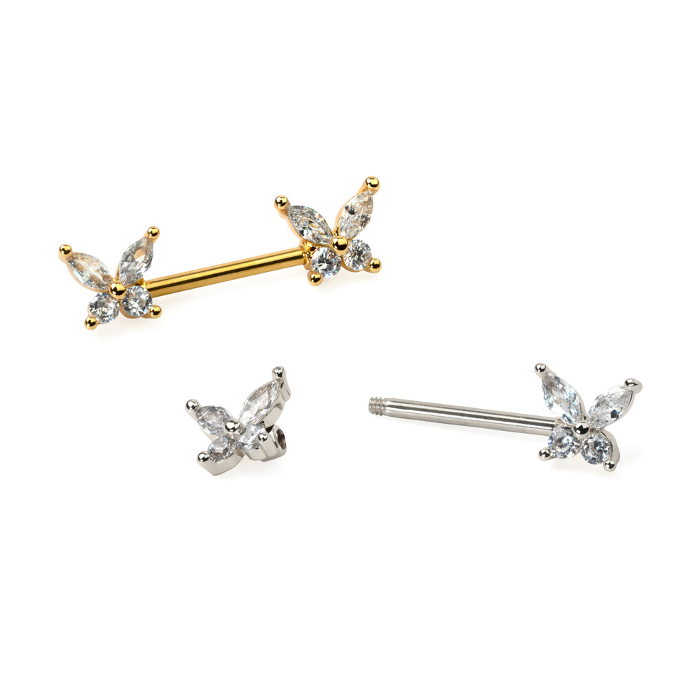 This stunning nipple barbell has two beautiful butterflies on each end adorned with gorgeous glittering stones. The jewelry consists of a 9/16" (14 mm) straight barbell, but the wearable length can vary, given the distance of the butterflies.