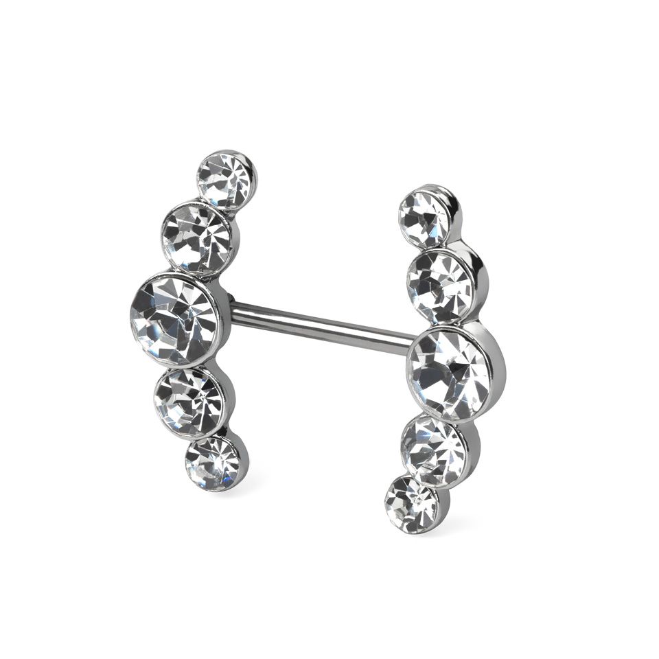 This nipple barbell consists of a straight bar and a vertical stone arch at each side. The stone in the middle is larger, while the other stones become gradually smaller towards the ends. The rows of stones are slightly curved, like arches that almost encircle the nipples.