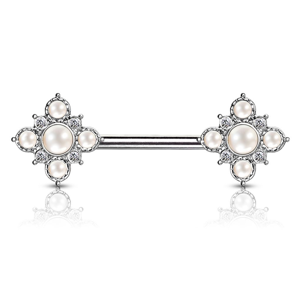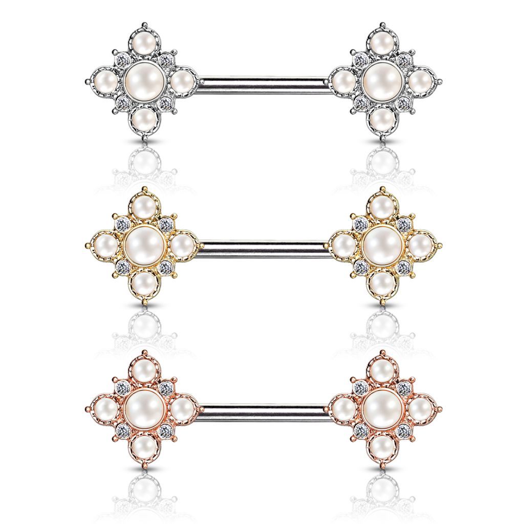 The barbell you can see above is for you if you have a nipple piercing - or both nipples pierced. The item consists of a bar in surgical steel with a length of approximately 1/2" (12 mm) between the flowers. Whether they are flowers or not, we leave it up to you, but with a little imagination, you can see a big pearl as the center of a flower and four smaller pearls as the petals. Between them, four tiny crystals add a beautiful touch to the whole item.