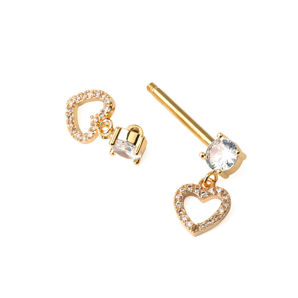This beautiful nipple barbell features a CZ stone at each end, attached to which is a charming heart dangle studded with more tiny CZ stones.