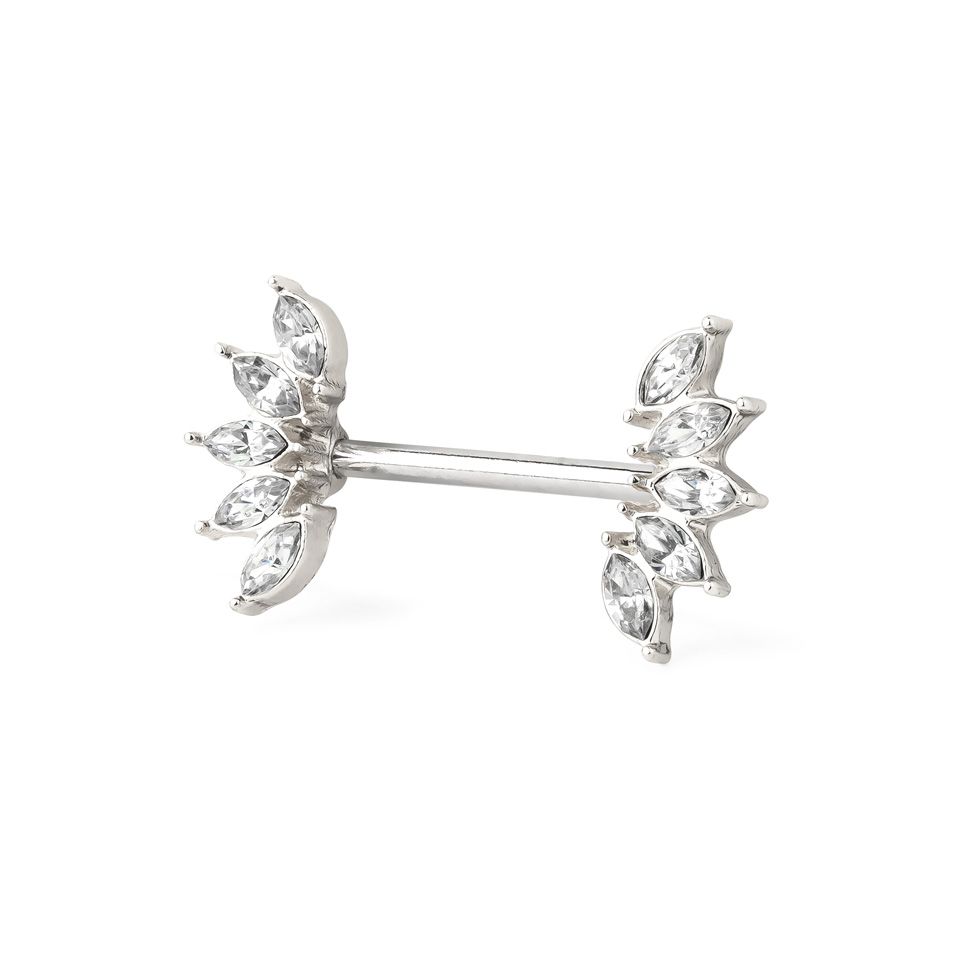The stones on this piece feature a marquise cut, which is the name of the shape in which the stones are cut. You could also call them oval. The difference is that an oval has round ends, while a marquise has pointed ends. The stones sit on each end of a 5/8" (16 mm) long bar. There are 5 stones at each end.