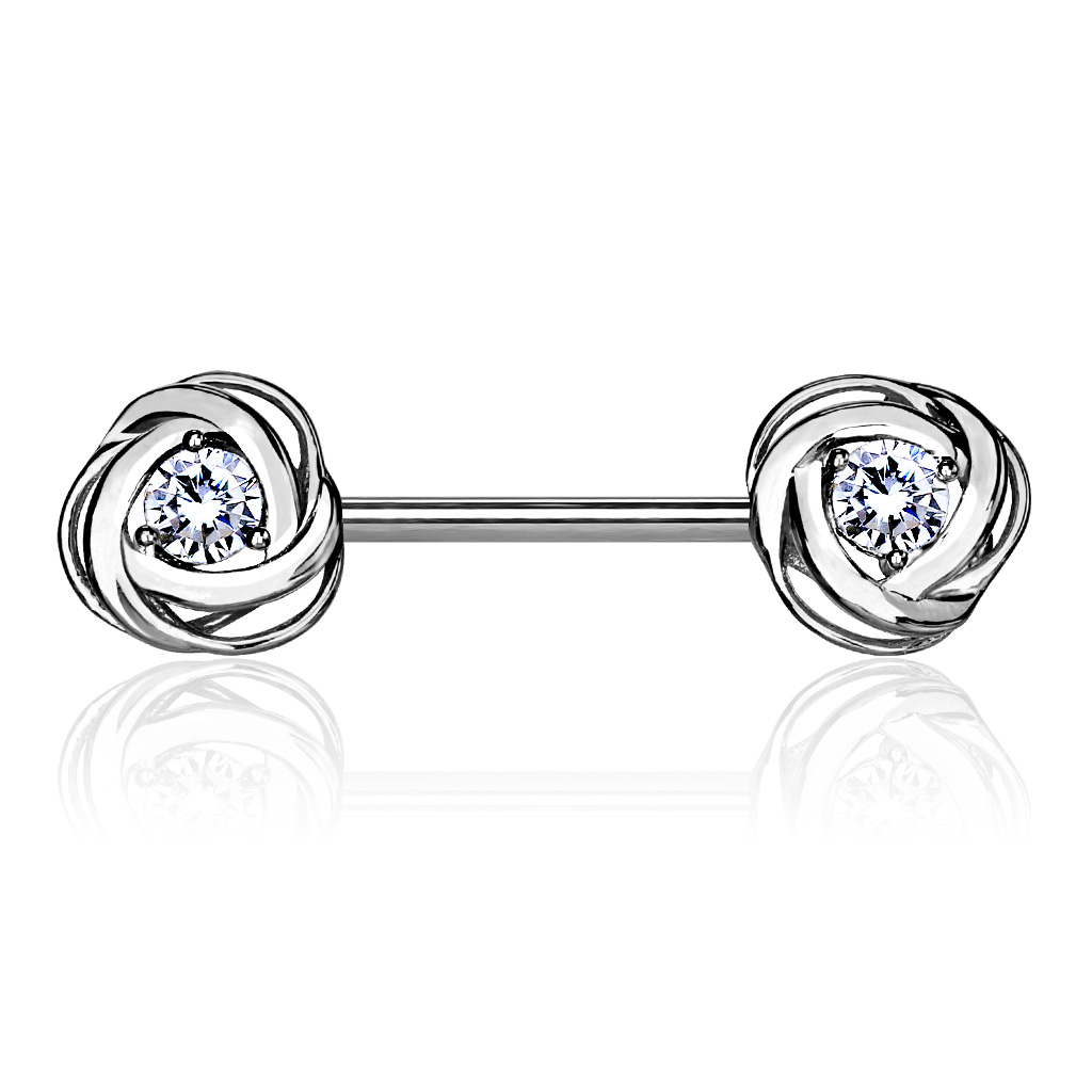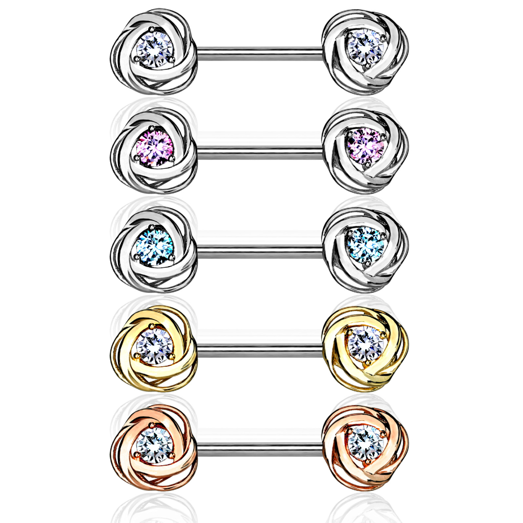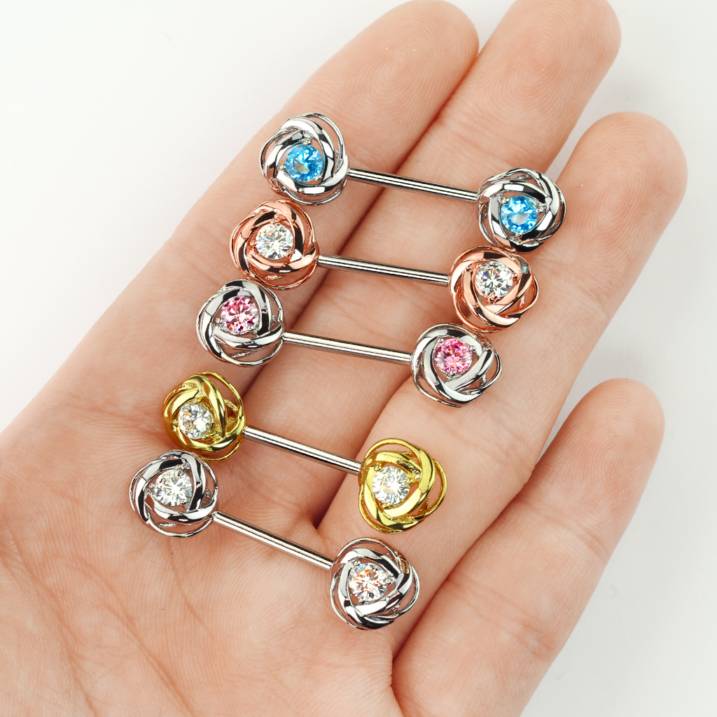 This exquisite and sexy jewelry will look perfect in your nipple piercing. The straight bar is made of surgical steel. There's a small rose made of brass on each end with a zirconia stone in the center. All the roses are plated with a color layer; the silver model has a metallic color, while the gold and rose gold models have a 14-karat gold plating.