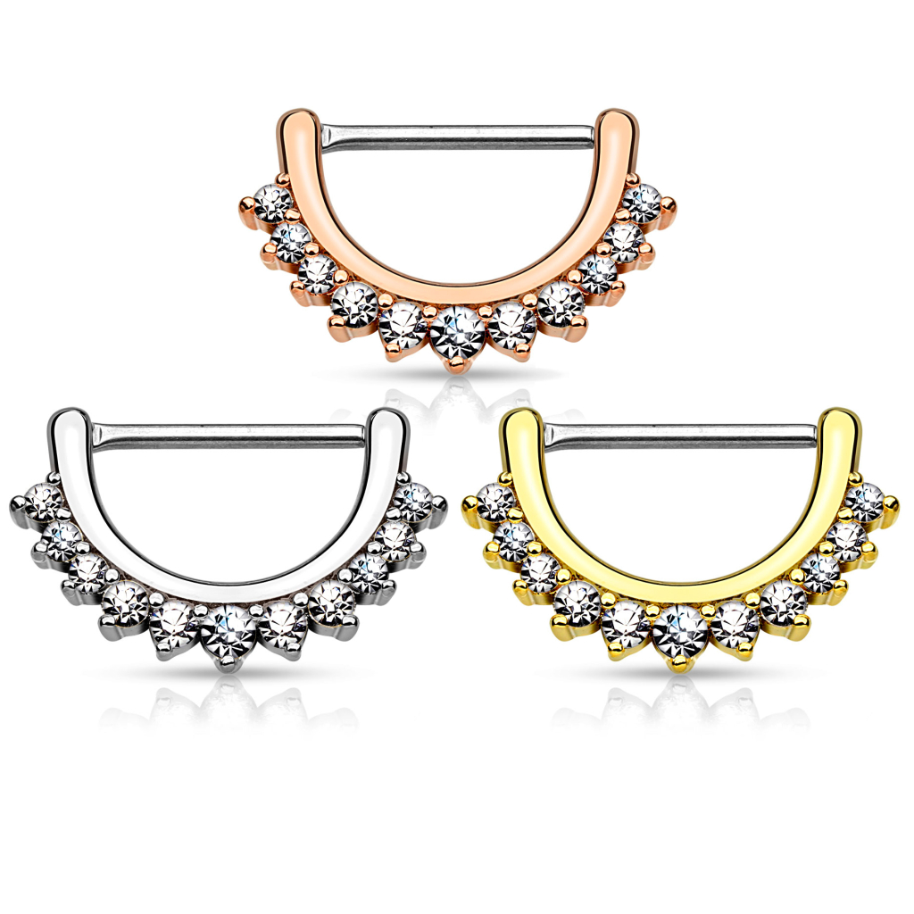 As mentioned before, this nipple clicker is available in three different colors: classic silver, golden, or a more modern rose gold. Whatever is the model you choose, you won't regret buying this beautiful jewelry with 11 stones that will look stunning as a half-moon under your nipple.