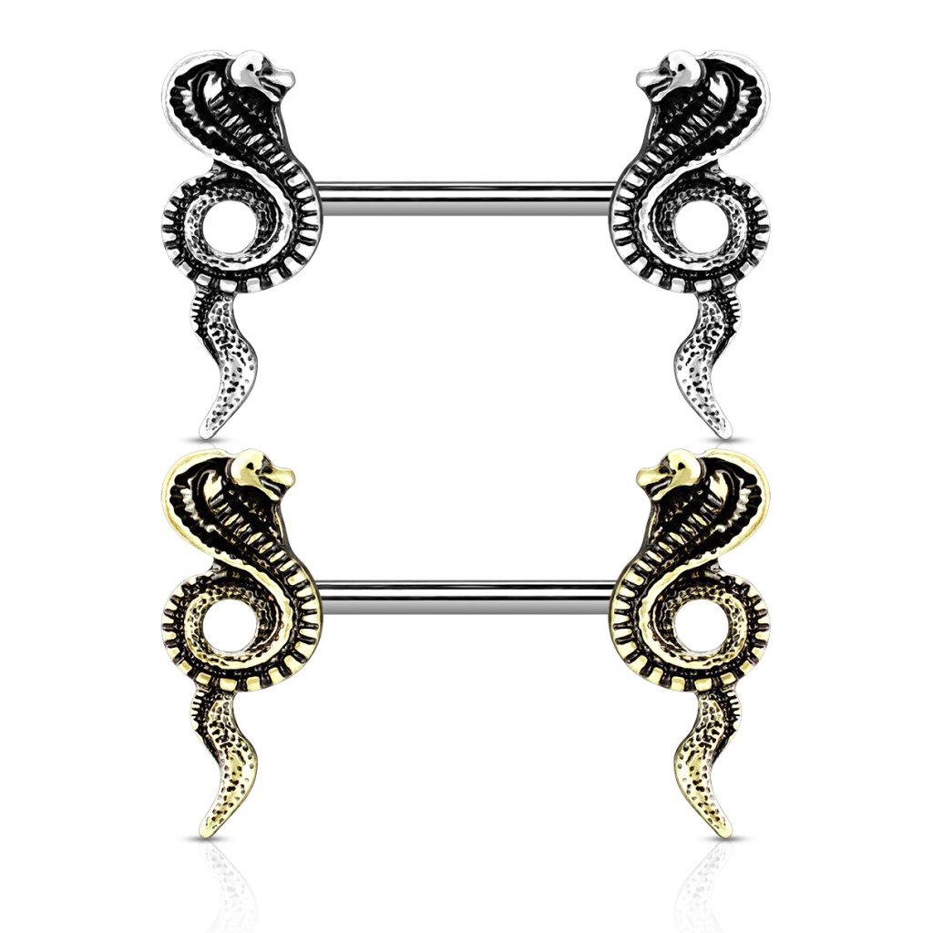 This barbell is not like ordinary jewelry. Regular nipple piercings consist of a straight barbell and two end balls, but creativity can be unleashed. This nipple barbell is made of surgical steel and features two original cobra snakes at each end. These are crafted from brass and coated in your choice of silver or gold color. Both will dress up your nipple incredibly. This barbell is designed only for the nipple piercing, as it's not suitable for other piercings such as the tongue.