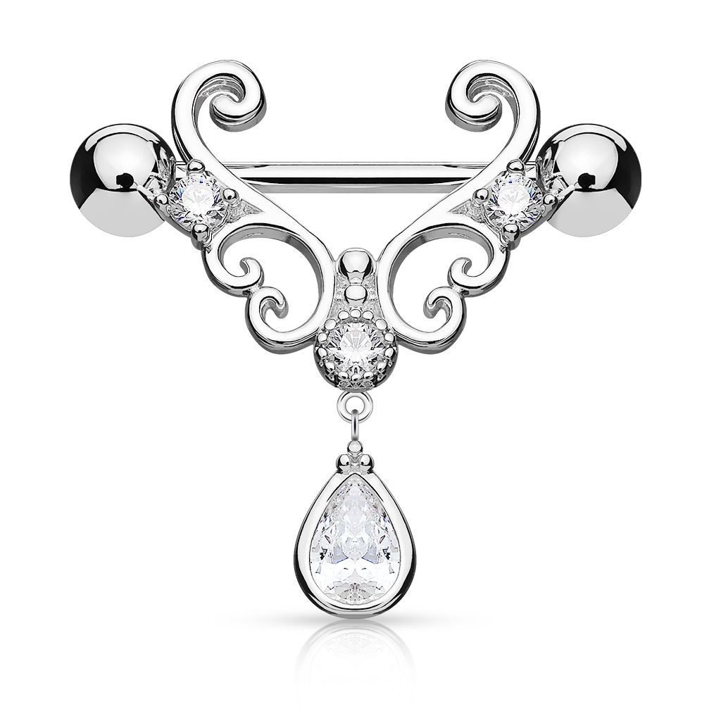 If you think the nipple shield in the picture is beautiful, believe us, it looks irresistible in your nipple piercing. The lovely shape of the shield frames the nipple impressively. It has a total of 4 stones; two on each side, and one in the middle; and the last stone, drop-shaped, hangs from the one in the middle. Besides, the jewelry has a heart and wavy shapes throughout the shield, creating an exceptional nipple barbell.