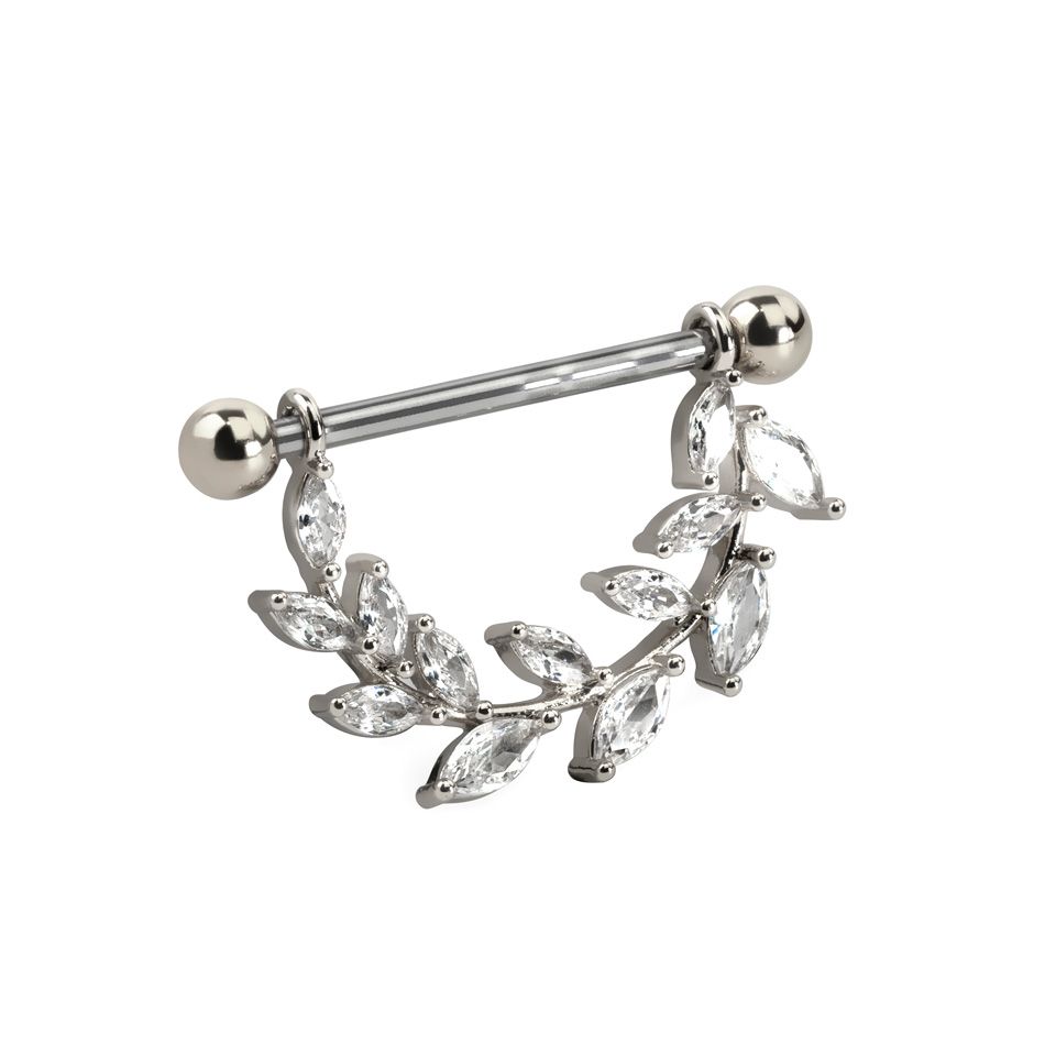 This nipple shield is perfect for you if you want a unique design. This nipple shield consists of a straight bar with a ball on each end. Both balls can be screwed on and off and can be replaced if desired. From the bar hangs a beautiful leaf with little oblong stones.