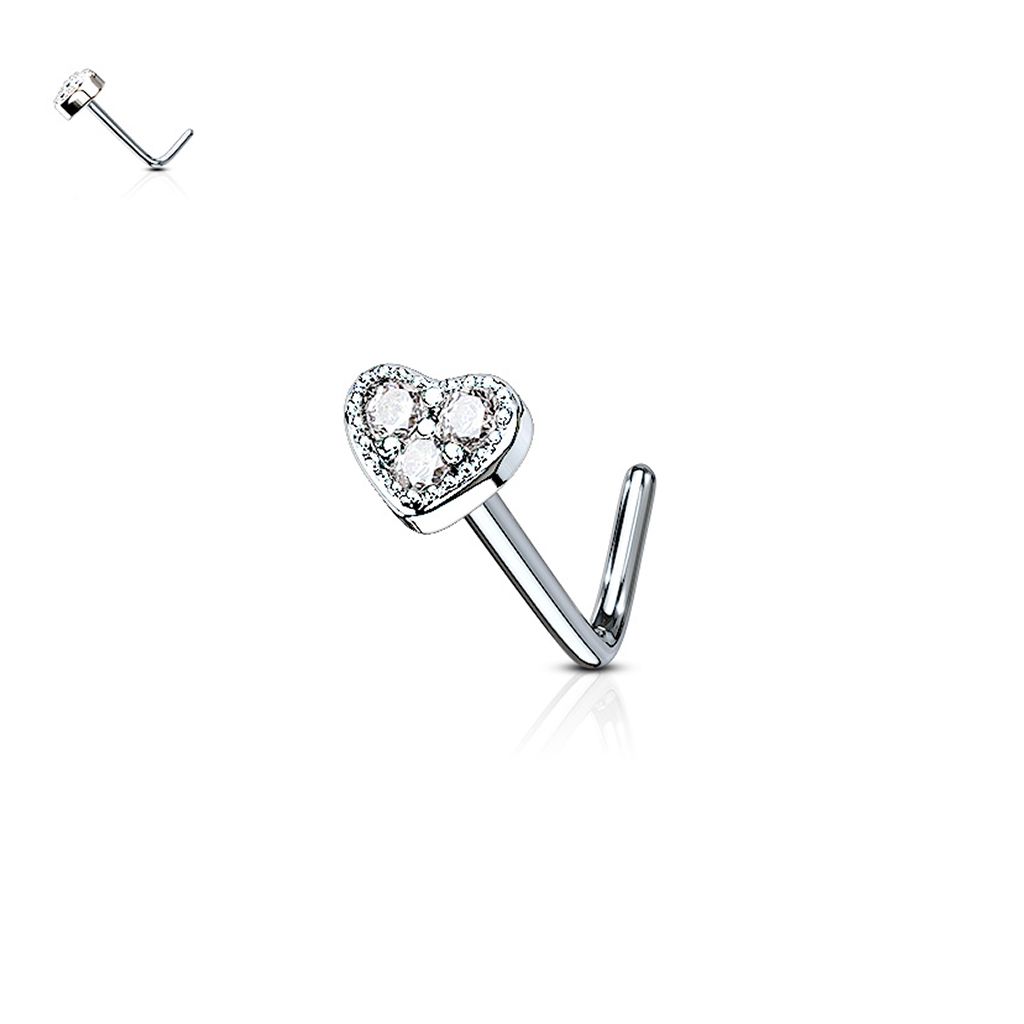 The nose stud has a beautiful heart with three zirconia stones on the top. You can choose between different colors for the heart and the stones. The silver heart has more possibilities; the gold and rose gold hearts are only available with clear zirconias.