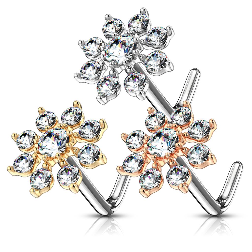 The ring's bar is made of surgical steel and shaped with a 90 degrees angle, thus creating the shape of an L. This means your stud will adjust to your nose, preventing it from falling out when you move your head.