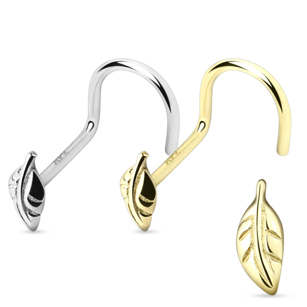 We offer a chance to get a special and feminine piece of jewelry made of 14-karat gold that features a beautiful leaf. The tiny leaf is slightly curved, making it look natural. It's made of solid gold and measures a thickness of about 1/8" (2.7 mm) and a height of approximately 1/4" (6.7 mm). Besides, you can notice a gorgeous structure on the leaf. This nose screw consists of a design inspired by nature that everybody will love.