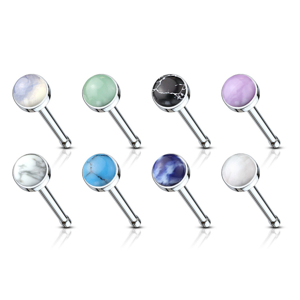 The bar is made of surgical steel and is approximately 1/4" (7 mm) long and has a bar gauge of 20g (0.8 mm). You can choose the stone you want for your nose stud from the eight different colors you can see in the pictures. The stones are, starting from the left: opalite, green jade, black agate, amethyst, white howlite, turquoise, sodalite, and pink quartz. All the stones have their significance, but if you know a bit about gemstones, we won't go into it.