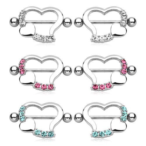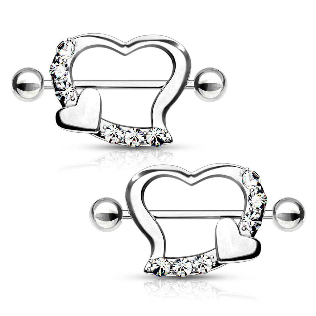 This is a set of two fabulous shields for your nipple piercing, heart-shaped and with a channel of six little stones on one side, apart from a smaller heart.