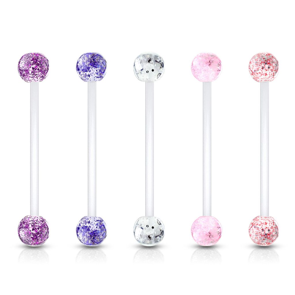 At each end of the bar, there's a beautiful acrylic ball. The balls are decorated with a beautiful glitter layer. The balls have a diameter of 1/4" (6 mm), and they're available in a variety of colors. Take a look at the menu on the right of the picture to select your favorite one.