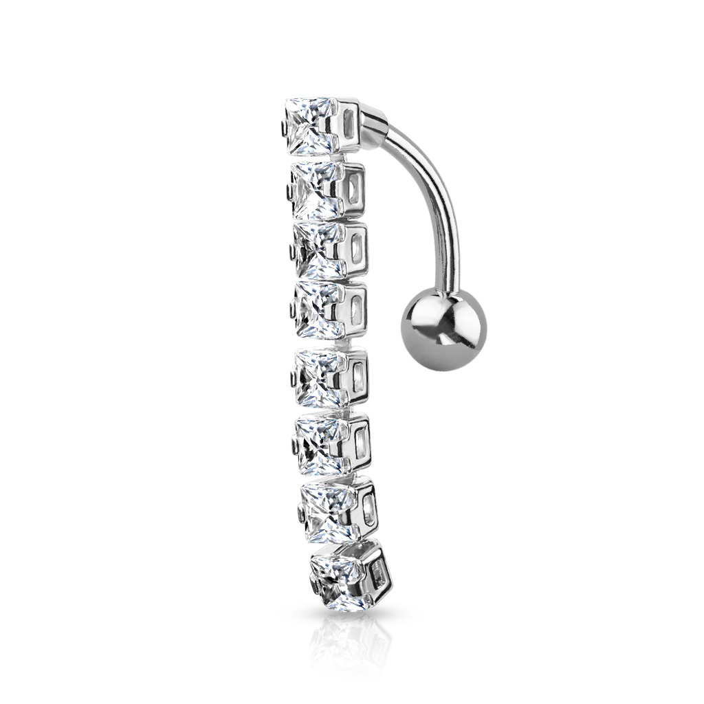 The piece of jewelry you can see above consists of a curved barbell made of surgical steel. At the bottom sits what would have been a top ball in a regular belly ring. However, since this is a reverse belly ring, the top ball is placed at the bottom. The pendant, which is usually placed at the bottom, is at the top. That makes it ideal for you if your piercing is in the lower part of the navel. However, you can also use it in a regular belly button piercing; in that case, the stones will stick out from above the navel and cover the barbell, the ball, and the belly button.