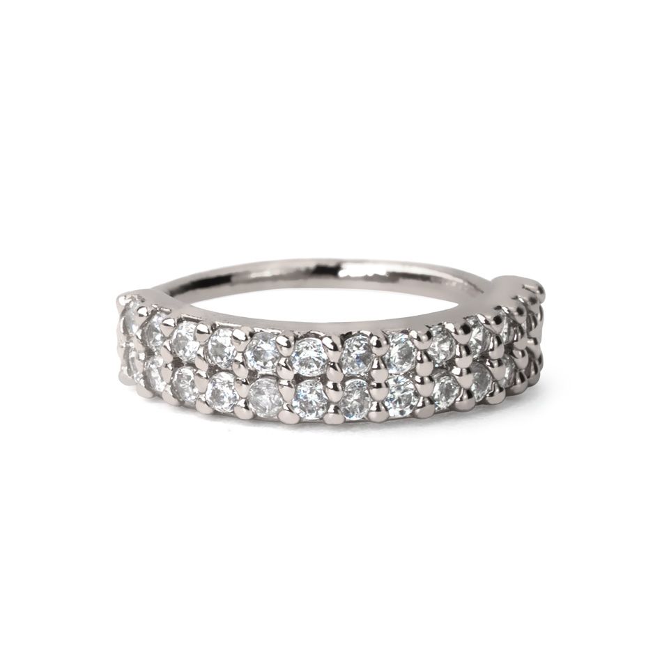 The ring features no less than two rows of stones that cover almost half of the ring - 26 little sparkling clear stones in total. The other half of the ring should sit in your piercing.