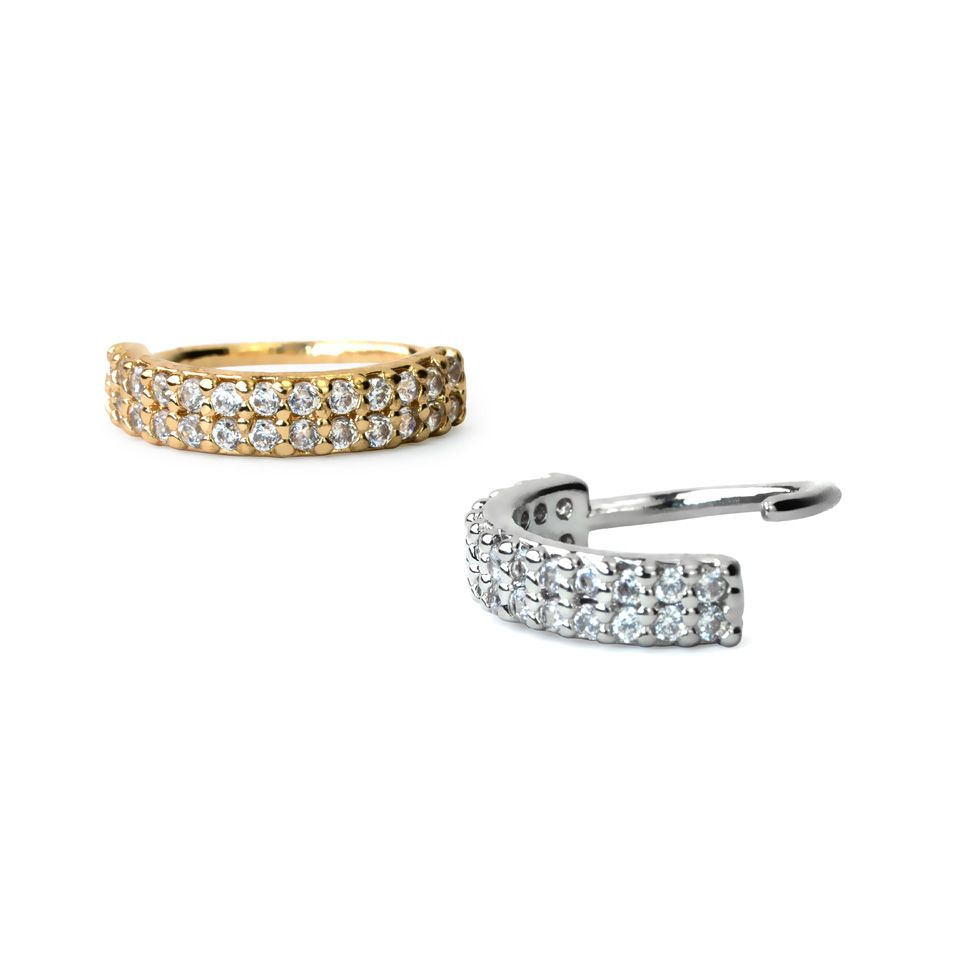 The ring features no less than two rows of stones that cover almost half of the ring - 26 little sparkling clear stones in total. The other half of the ring should sit in your piercing.