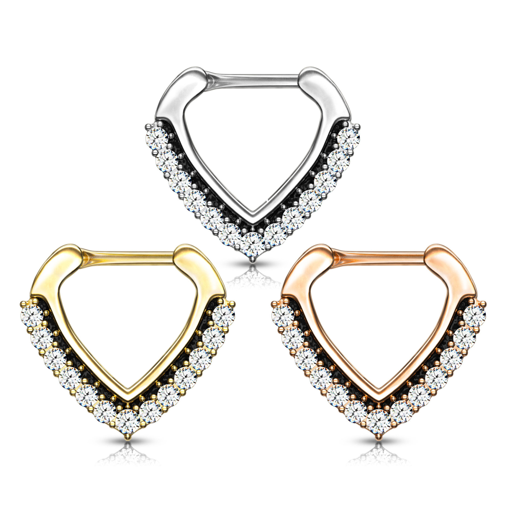 The beautiful curved design of this clicker resembles a soft V. Both sides of the V are covered with tiny stones on a dark enameled background that gives the jewelry an antique look. The hinged bar that goes through your piercing is made of surgical steel, while the rest is crafted from brass. The whole piece has subsequently been color-treated so that you can choose from three different colors.