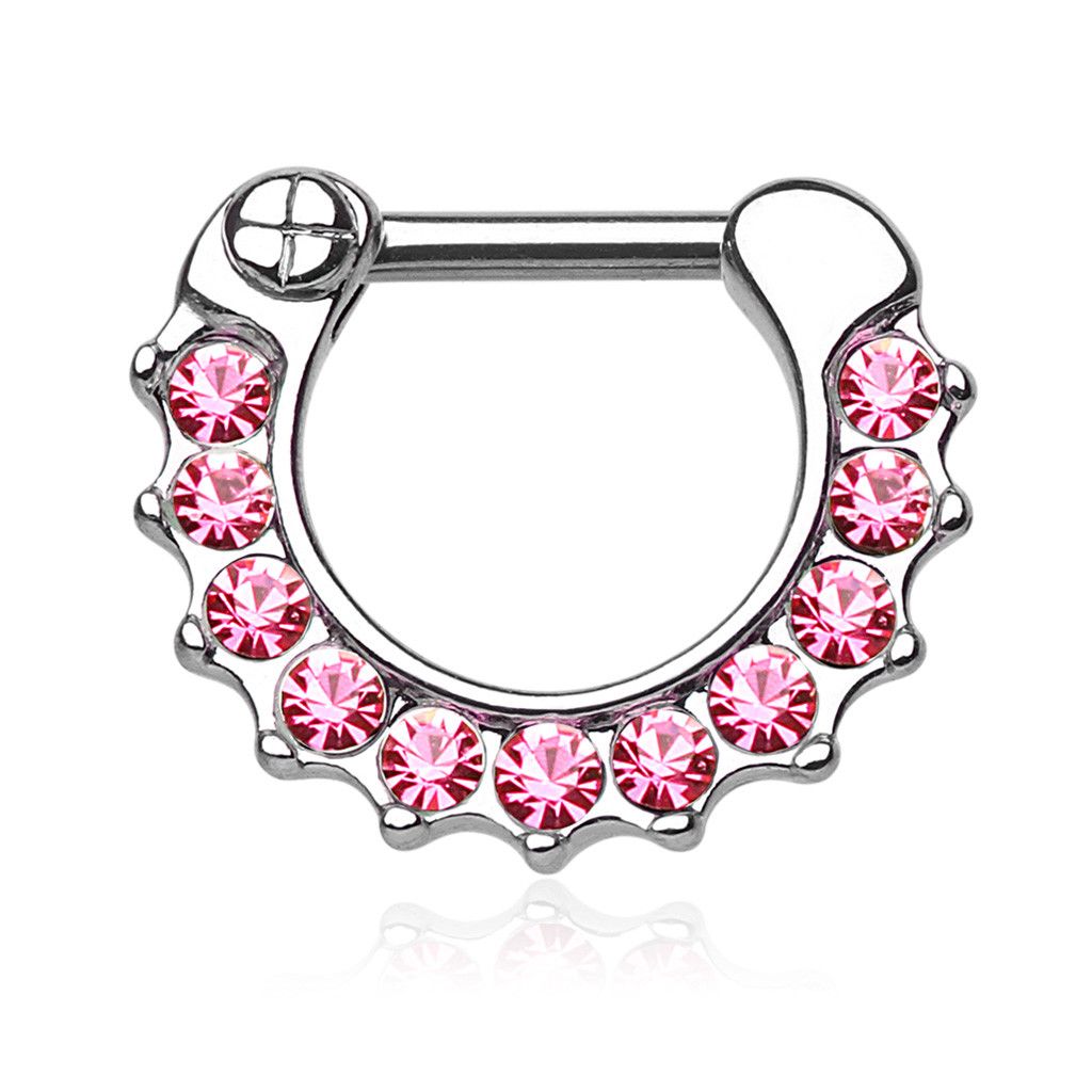 This septum clicker is studded with beautiful stones along the edge, which has a thickness of 1/8" (3 mm). There's a total of 11 stones on the ring, faceted with a diamond cut. This special cut allows light to reflect from different angles, so it's a unique septum ring.