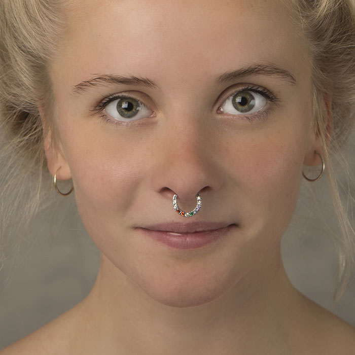 If you're looking for new jewelry that is elegant and beautiful for your septum piercing, we have the perfect septum ring for you. This stunning ring has a classic design that allows you to wear it every day. It has the shape of an endless hoop, with an edge decorated with ten pretty stones that will dazzle you.