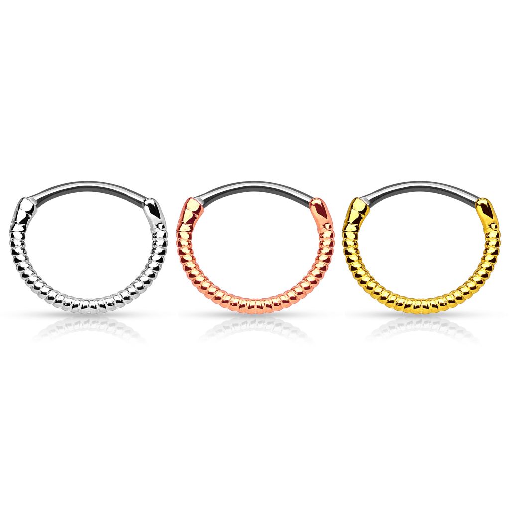 This septum ring has a clicker mechanism, which means that it has an easy and effective locking system. One end of the bar is joined to the ring by a hinge, while the other end clicks open and shut.