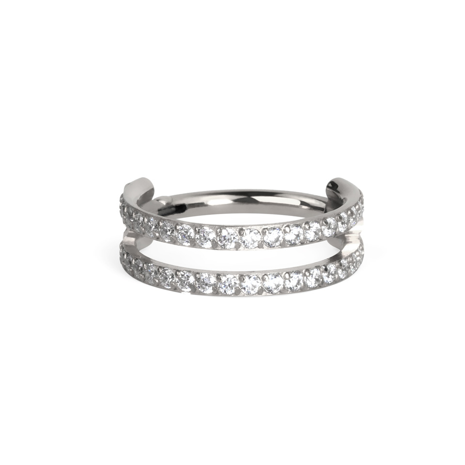 This fabulous double ring boasts two semicircles lined with gemstones of clear zirconia. If you're a fan of glitter and glam, why not double down?