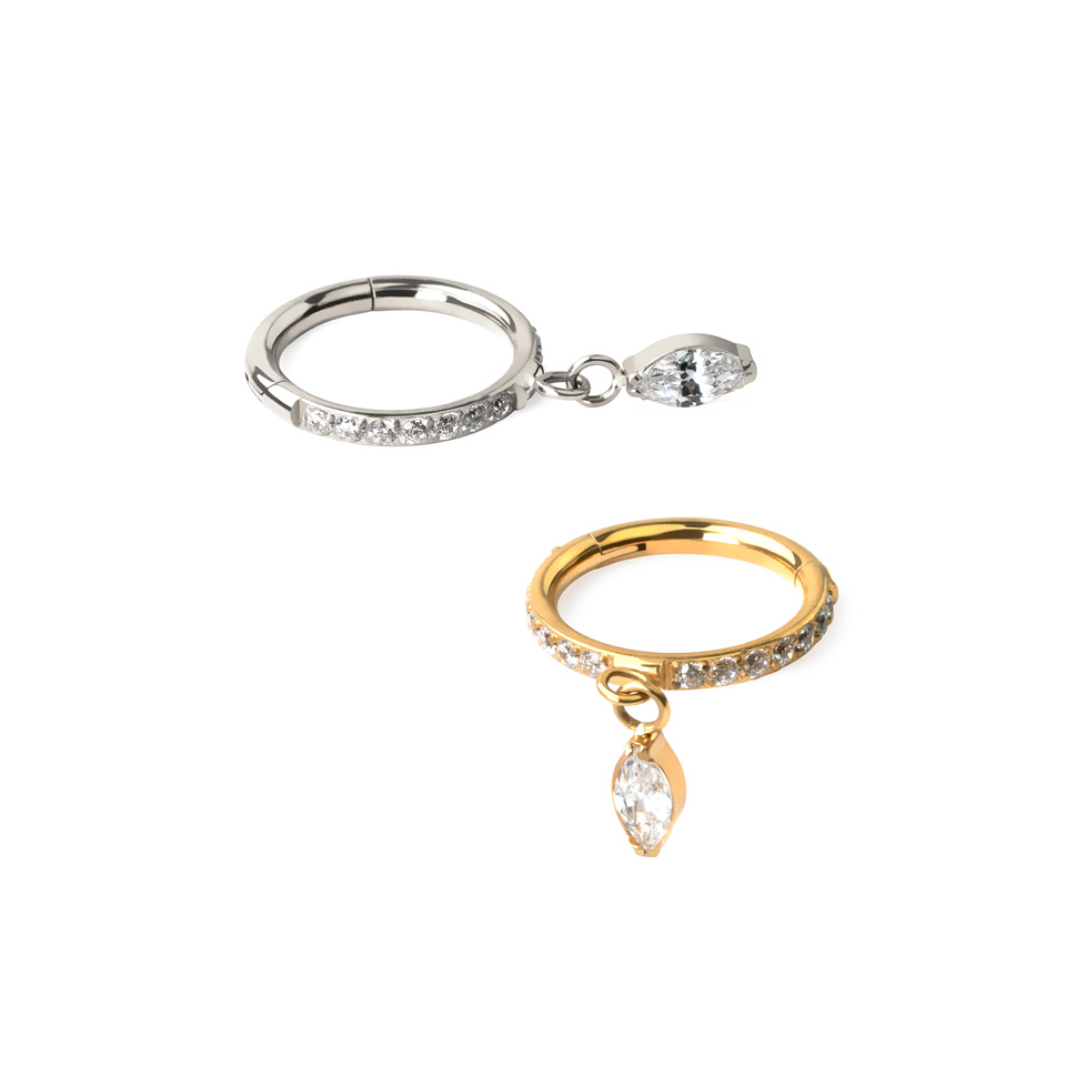 Name: Titanium hinged ring with forward facing stones and marquise cut charm