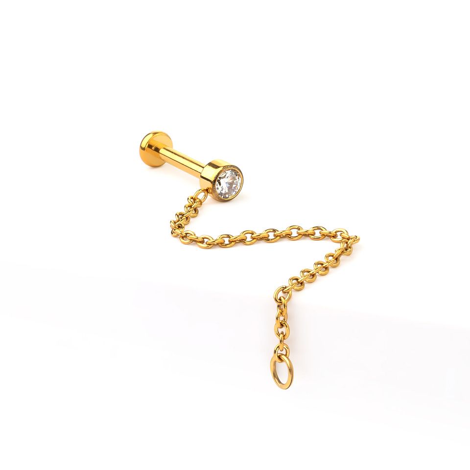 This simple labret has a bezel set gemstone design, and a chain attached to the bottom of the setting with a tiny loop. The chain has a larger loop at the other end, so you can either attach it to the back of the labret so that it loops over your ear, or link it to another piece of jewelry in your ear stack.
