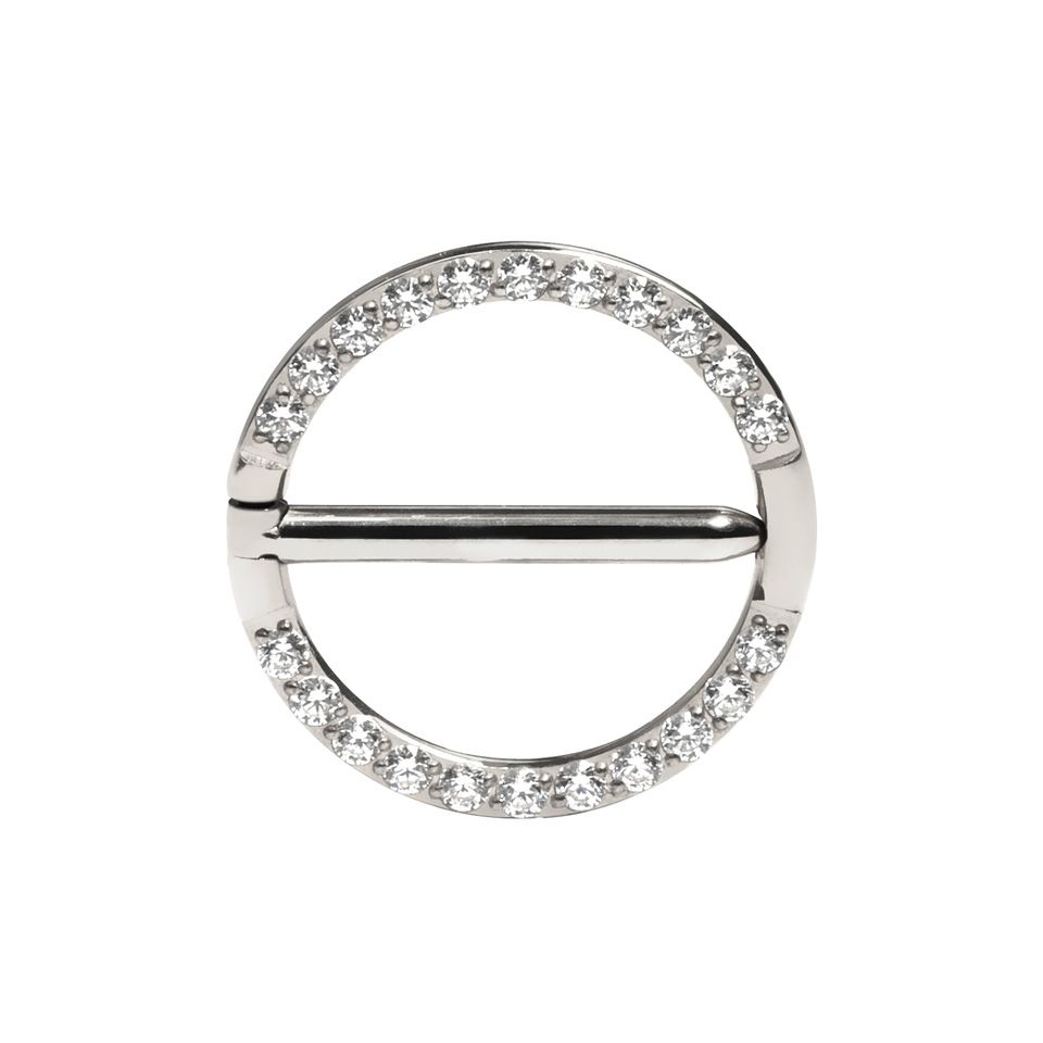 This stunning hoop-shaped titanium nipple clicker features pave-set CZ stones that will beautifully frame your nipple. It is made from titanium, which makes it hypoallergenic and very comfortable to wear. It is available in two different lengths, 12 mm and 14 mm, and in a choice of gold or silver finishes.