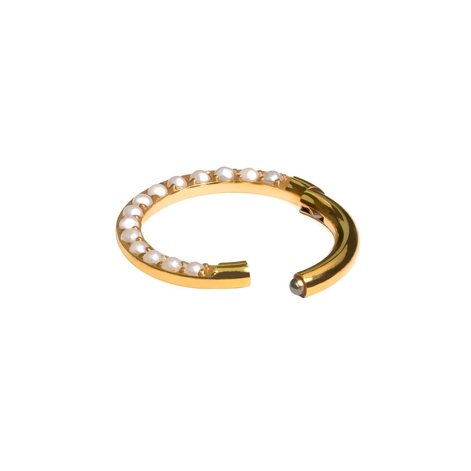 This hinged titanium ring is studded with synthetic pearls along the front, perfect for wearing in piercings such as septum or daith.
