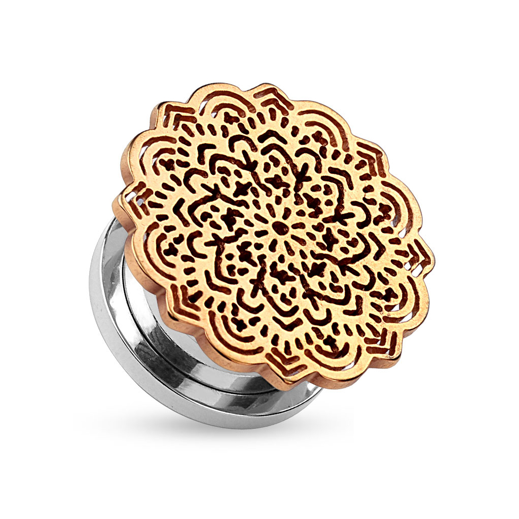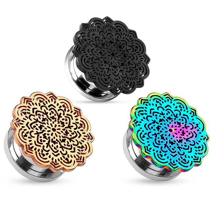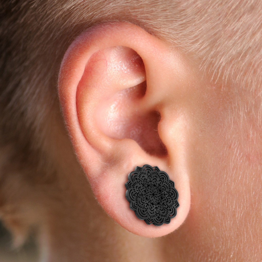 You can choose this beautiful and detailed mandala from different colors, classic or vibrant. When the tunnel is in the earlobe, the mandala is the only visible part. The back is made of surgical steel, which can be unscrewed for easy insertion and removal.