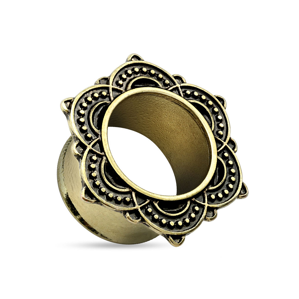 If you are looking for a unique piece of jewelry, you will love this tunnel. It's made of surgical steel and has undergone a particular coating process to make it look like antique gold. The edge of the front side features a beautiful rose of Sharon made in brass.