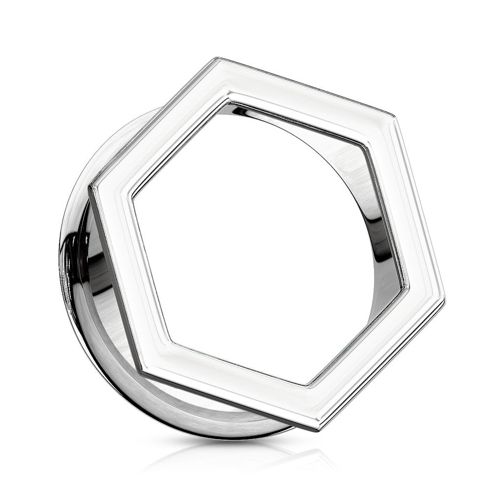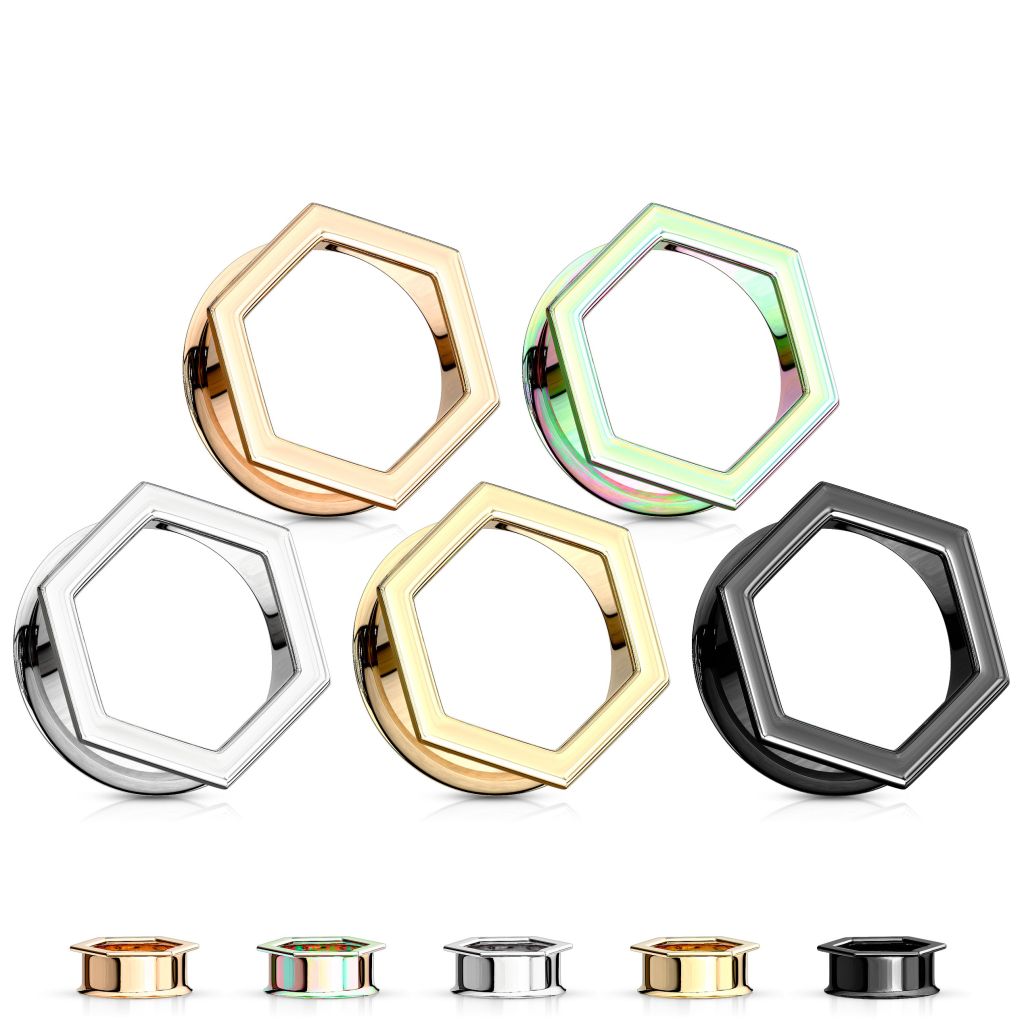 This original surgical steel tunnel features a hexagon top and an elevation at the back. It can also be described as a double flared tunnel, which ensures a good fit. The back makes it unnecessary to equip the tunnel with threads.