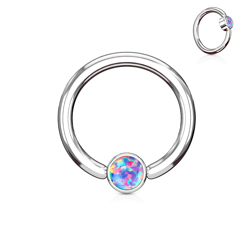 The opal mentioned is not a real opal gemstone, as they are fragile and not very suitable for piercing jewelry. This captive bead ring features a synthetic opal, making it more durable. However, you can hardly notice any difference from a real gemstone.