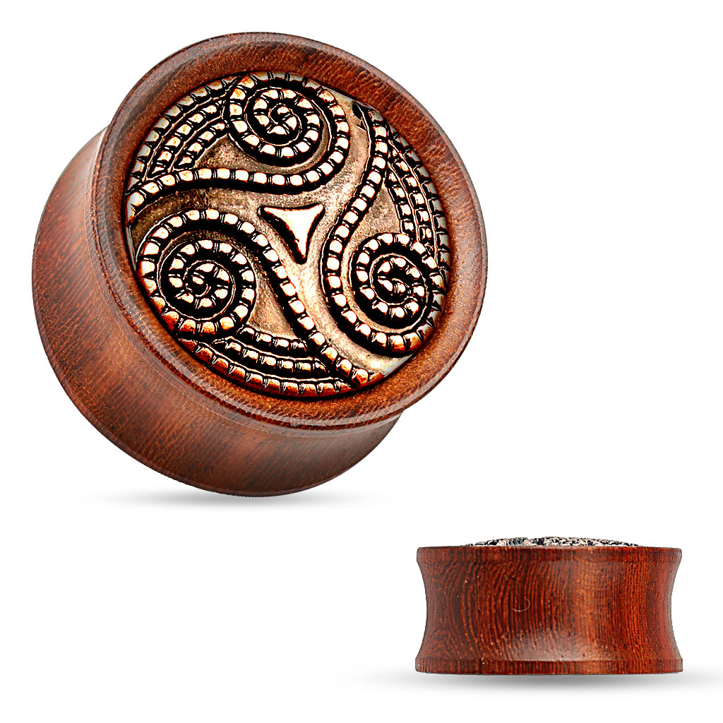 The beautiful motif of three spirals is symmetrical around the dots. It's made from a brass plate that makes a beautiful contrast with the color of the wood.