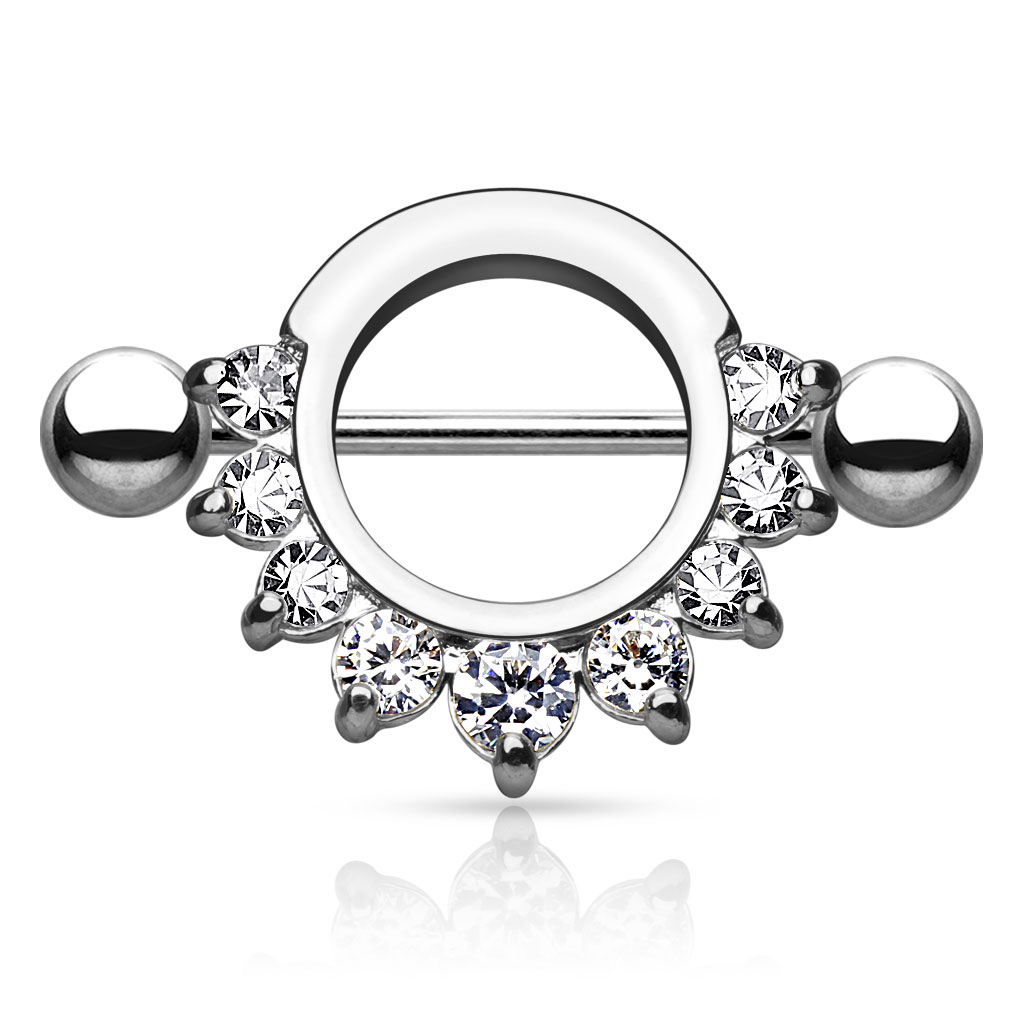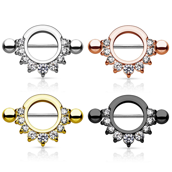 It's about time you pamper your nipple piercing with new beautiful jewelry. This nipple shield includes a straight barbell behind it. In the front, the shield holds nine beautiful stones that create a half-moon on the bottom.