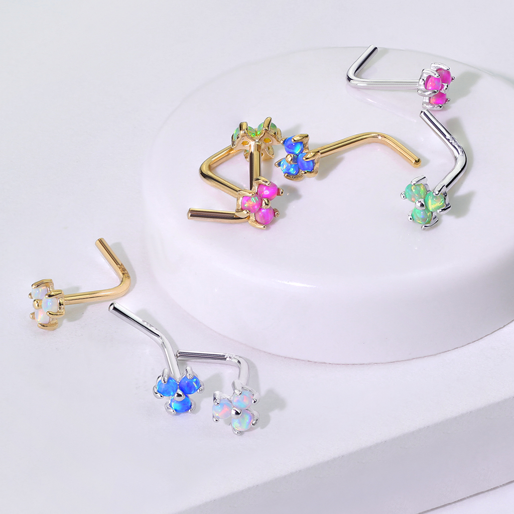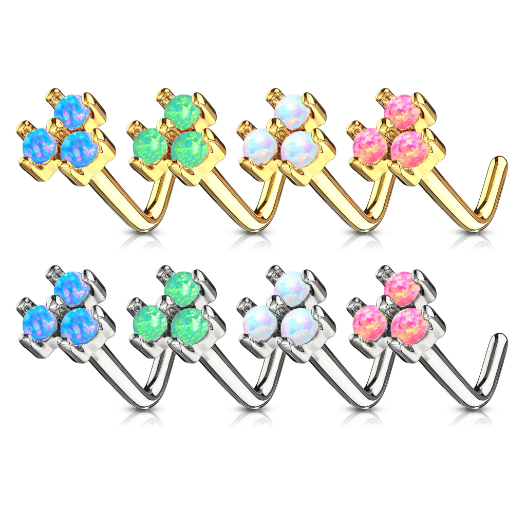 You're looking at a 14-karat gold nose ring with three opal stones. This piece is available in two different gold variants, namely classic 14k yellow gold, or a 14k white gold edition - both are equally beautiful.