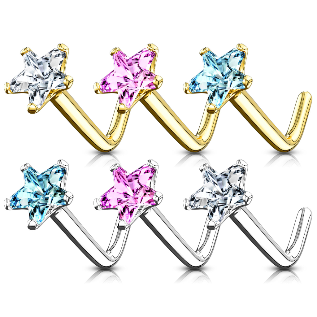 Shine like stars with a gorgeous and feminine nose stud featuring a star-shaped stone. The stone is facet cut on different sides, so when light reflects on it, it shines bright. It has the same cut as diamonds in the jewelry world. Besides, you can choose from three different colors: the transparent stone is perfect for a classic look, the pink stone will bring out your most feminine side, and the turquoise model will give your outfit a fresh and exclusive look.
