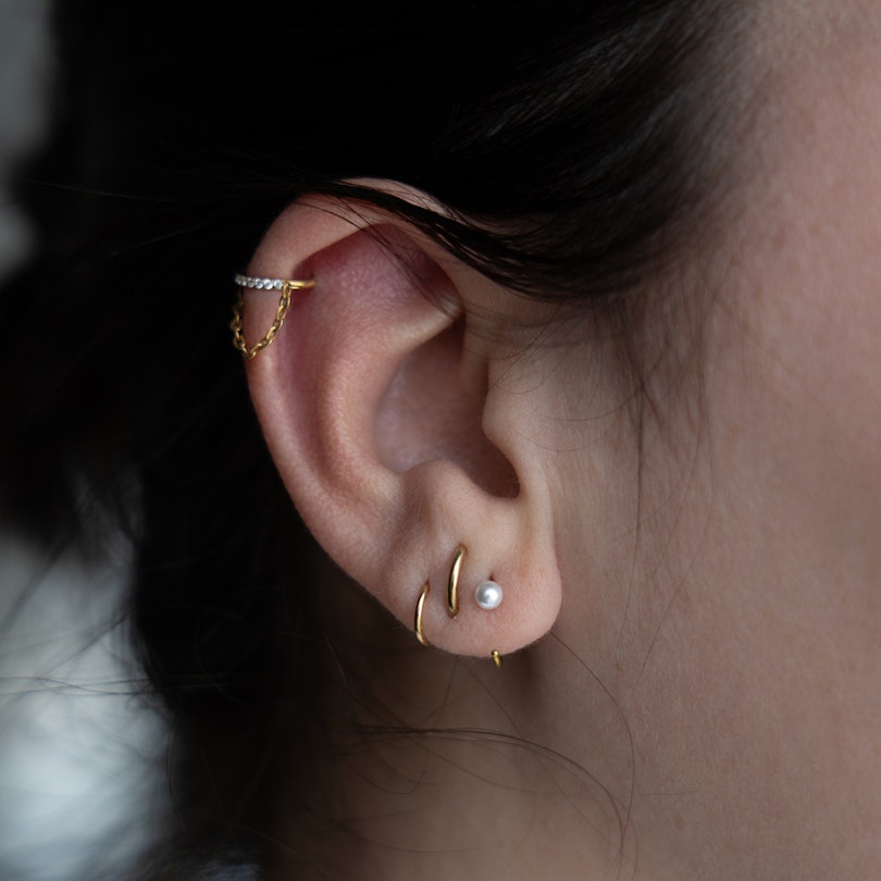 The pearl titanium open hoop brings an easy switch to your ear lineup. A single pearl sits at the end of the curve, giving you a softer look without trying too hard. To wear it, guide the open end through your lobe and rotate it forward until it sits comfortably. You can wear it on your lower or upper lobe, and stack it whenever you feel like mixing things up.