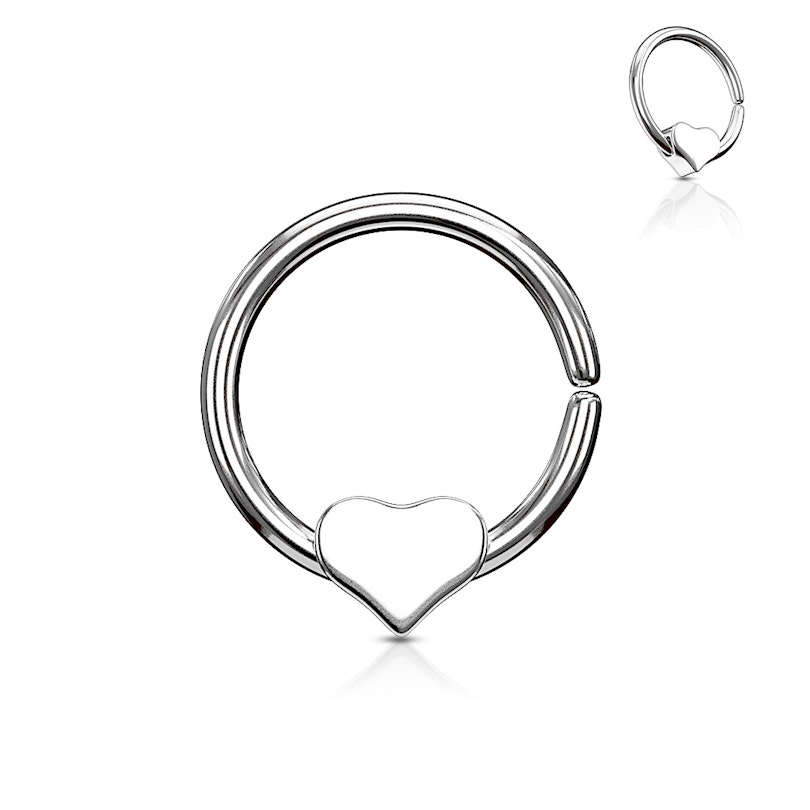 This ring consists of two separate parts made of surgical steel: a seamless hoop with a small opening, and a heart. The heart can be inserted into the ring through a hole and taken out when you like. The law of gravity will be responsible for ensuring that it stays on the lower part of the ring.
