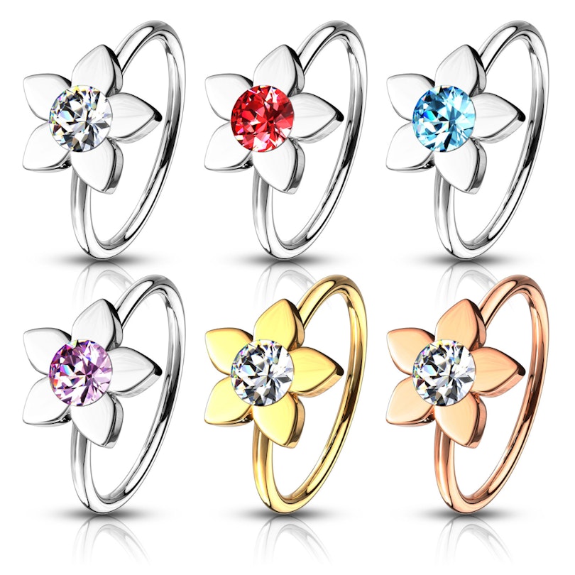 If you're looking for a ring with strong symbolic meaning, you landed in the right place. The item you clicked on is a seamless circular nose ring with a lotus flower charm at the front. Inside the flower, there is a round stone, which you can get in the color of your choice. For example, you can get it in pink or red.