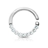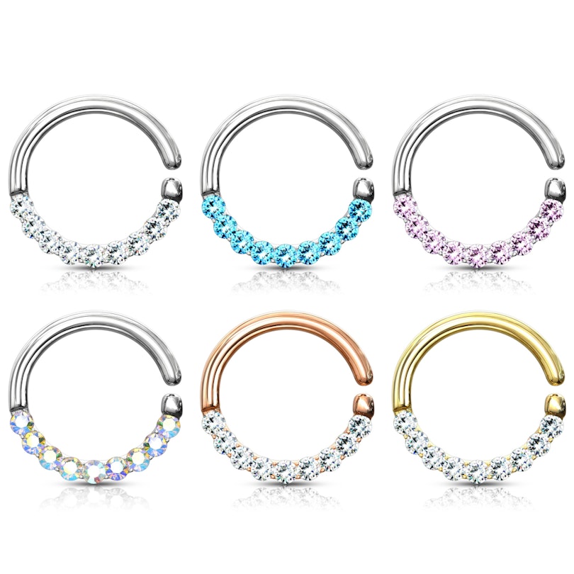 The type of jewelry you see in the picture above can not only be worn in the nose but also many other body piercings. As long as the barbell's gauge matches that of your piercing hole, you can wear it in different parts of the body. This is possible because it's a seamless ring with a side opening, so it does not come with a closing mechanism. To open it up, twist the ends forward or backward. Avoid distorting it over time, as it would happen if you pull the ends apart sideways. The ring is made of brass and has different coatings: if you pick one of the silver color models, it's coated in platinum. However, the models in yellow and rose gold color are plated in 14-karat gold.