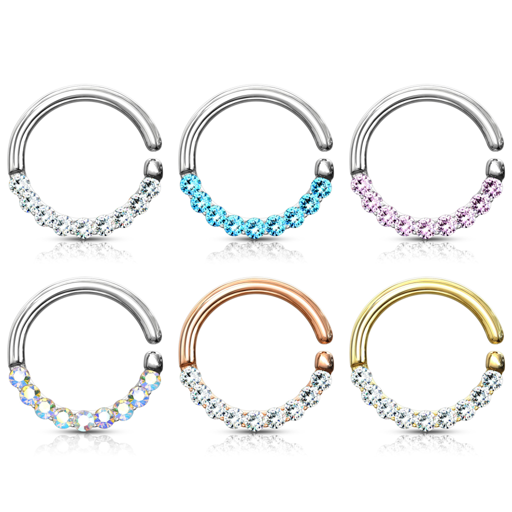 The type of jewelry you see in the picture above can not only be worn in the nose but also many other body piercings. As long as the barbell's gauge matches that of your piercing hole, you can wear it in different parts of the body. This is possible because it's a seamless ring with a side opening, so it does not come with a closing mechanism. To open it up, twist the ends forward or backward. Avoid distorting it over time, as it would happen if you pull the ends apart sideways. The ring is made of brass and has different coatings: if you pick one of the silver color models, it's coated in platinum. However, the models in yellow and rose gold color are plated in 14-karat gold.