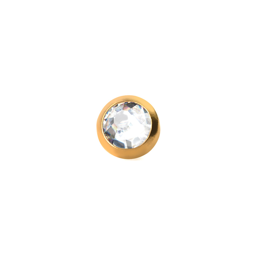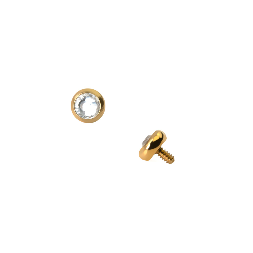 This bezel circle gem for dermal anchors consists of a small flat disc featuring a crystal clear zirconia stone.