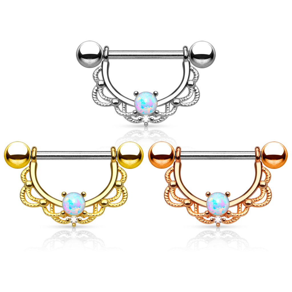 Pamper your nipples with this beautiful barbell that spares no beautiful details. The nipple shield holds a beautiful and elegant filigree that hangs symmetrically like a chain, with a beautiful opal stone in the middle. The filigree has rounded edges, spreading a harmonious sensation with the round opal.