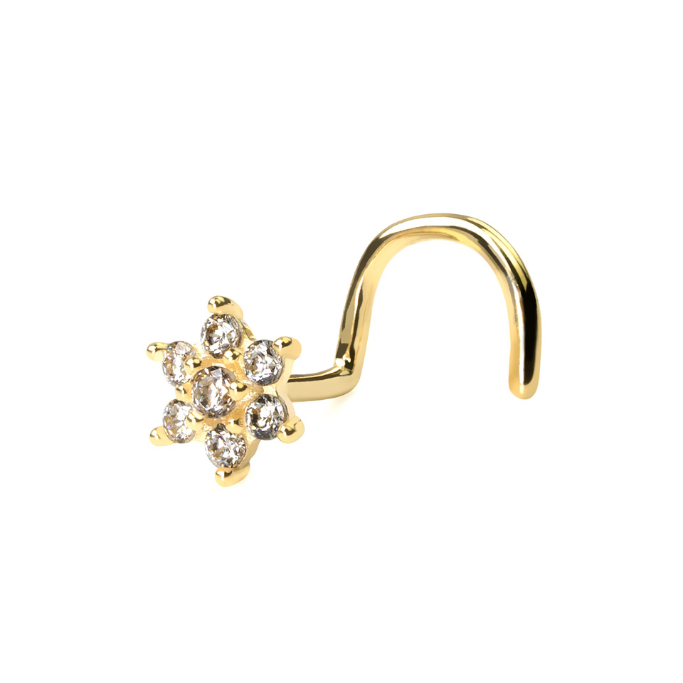 This beautiful 14-karat nose screw has the most beautiful and delicate flower. It consists of seven beautiful stones, six of which surround the seventh one, in the center. All the stones are held in the structure by several prongs that ensure that they won't fall out.