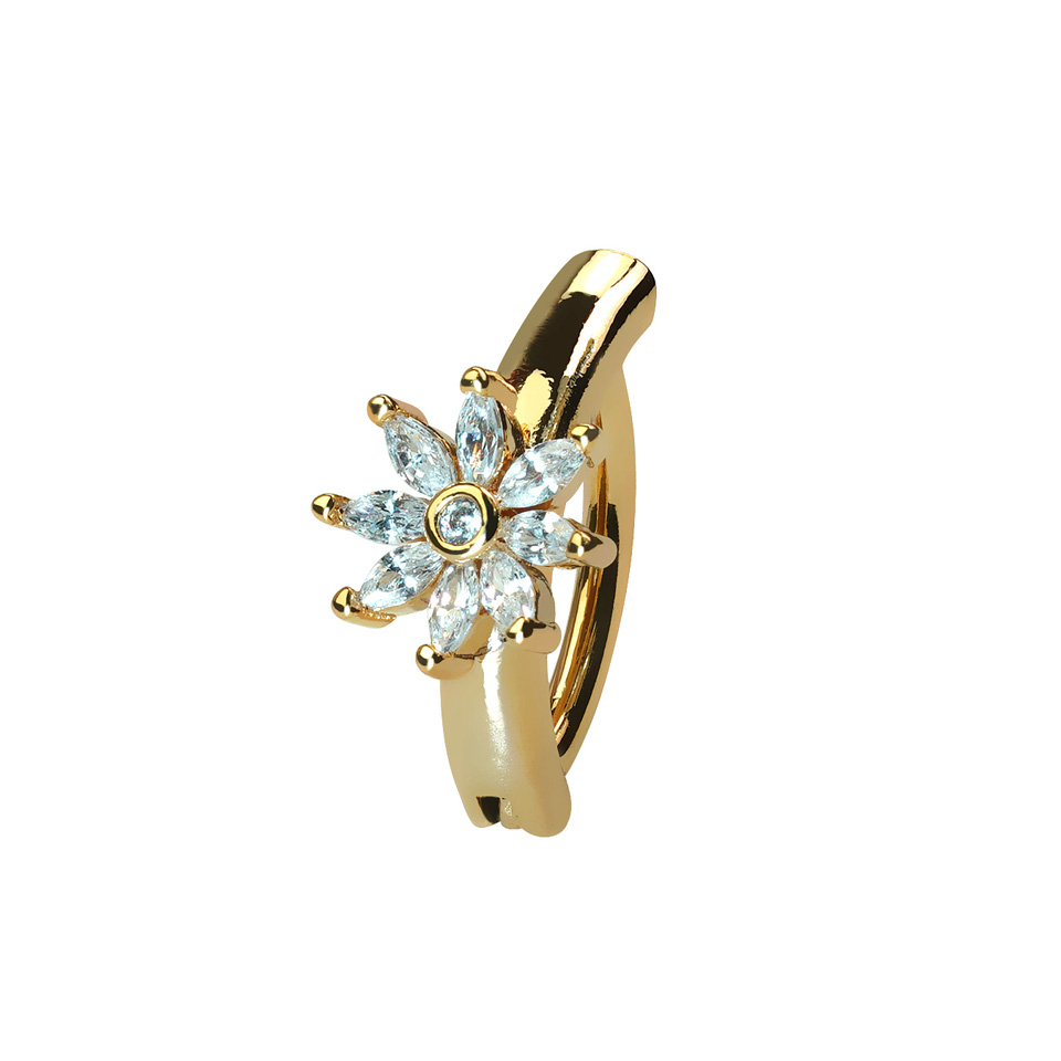 Tento štýlový clicker krúžok do pupka má v strede trblietavý kvet, ktorý je tvorený 9 zirkónmi. Tento šperk je k dispozícii v zlatom alebo striebornom prevedení.