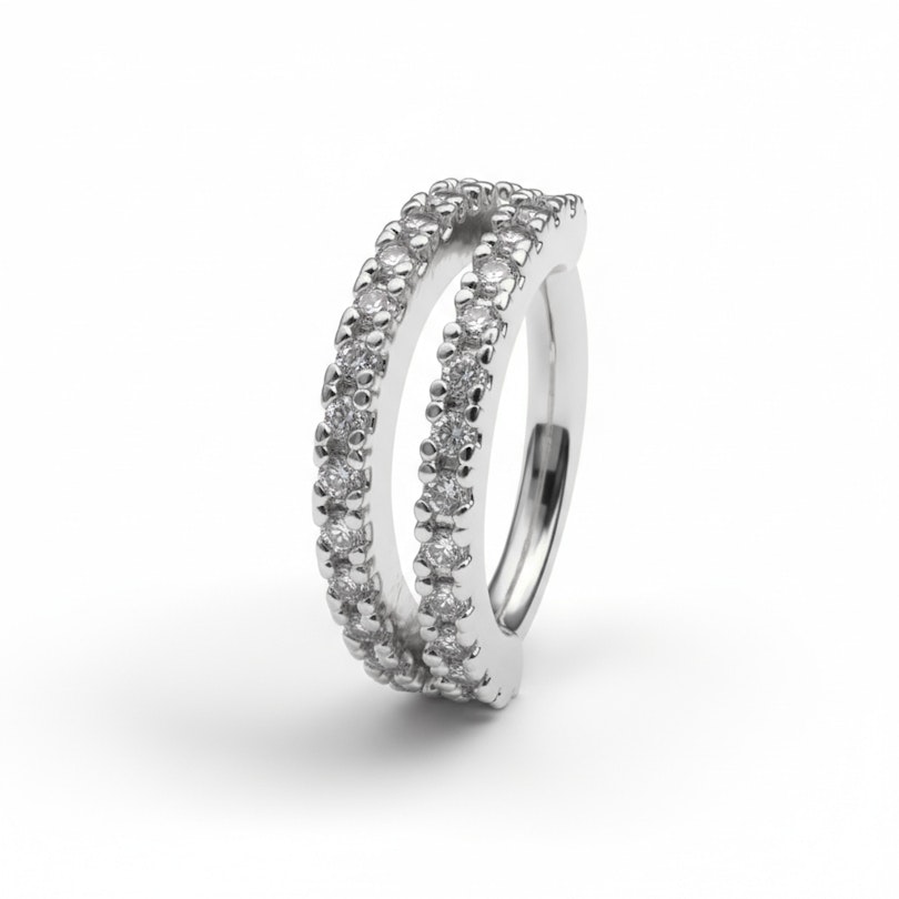 The ring is available in three different colors. The only difference between the models is the color, as the shape, size, material, and everything else are the same no matter what color you choose. The ring is made of brass and has been plated in platinum for the silver-colored model and in 14-karat gold for the golden models. The ring has a thickness or gauge of 16g (1.2 mm) and a diameter of 5/16" (8 mm). In all, as far as we can count, there are 30 clear stones on each ring.